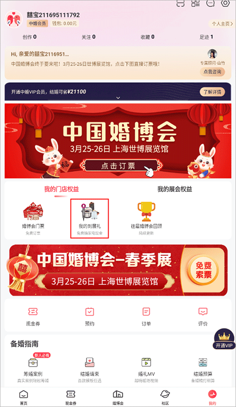 1、登录婚芭莎中国婚博会app进入“我的”一“到展礼”