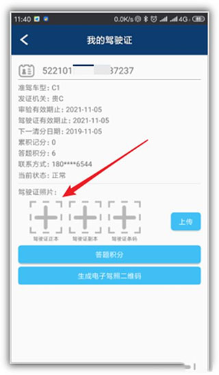 9、接着,返回到“我的驾驶证”页面,点击“上传”。