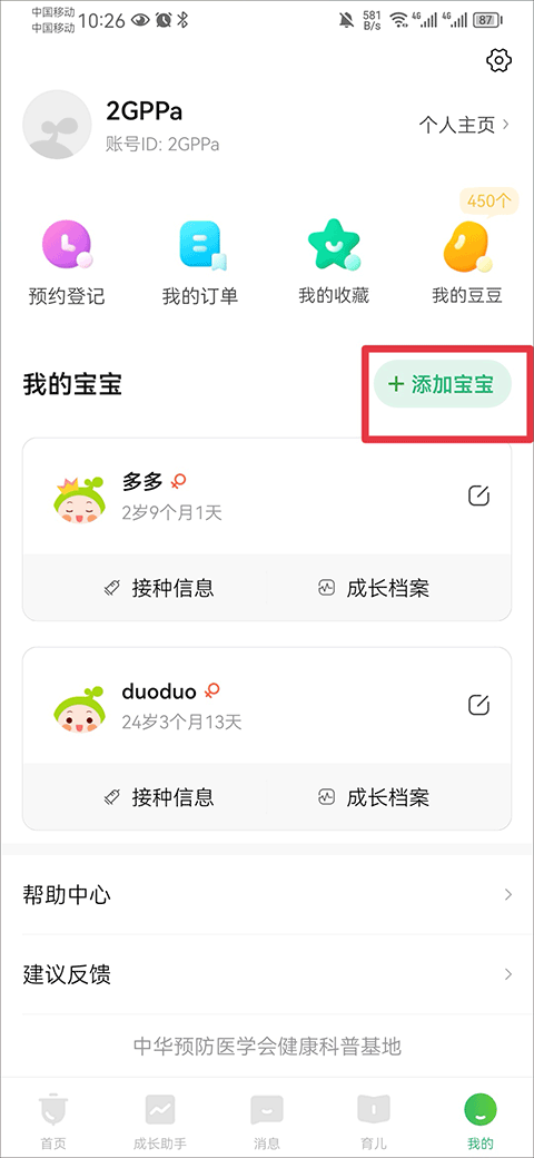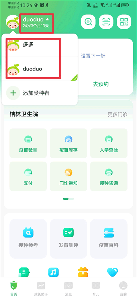 3、接着在首页中点击宝宝的名字,并选择你要切换的宝宝名字即可完成切换另一个宝宝
