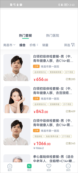 2、在体检这一界面可以对比一下体检套餐和医院的价格差别差多少