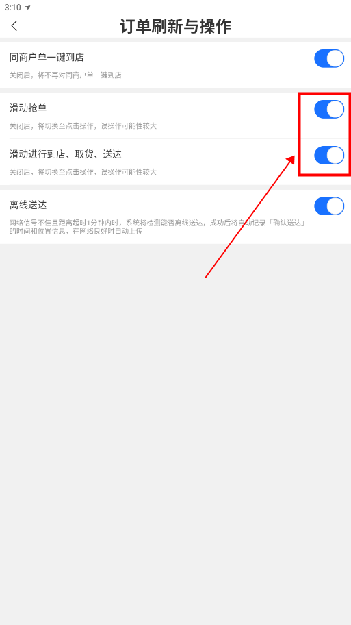 4、可以将“滑动抢单”与“滑动进行到店、取货、送达”两个都打开,可以更快的实现抢单。