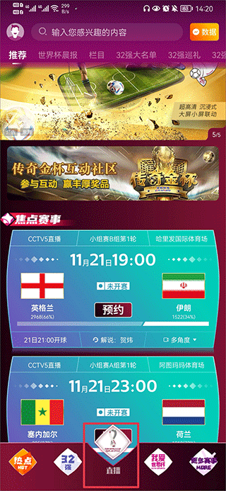 1、打开卡塔尔世界杯直播app,在首页中点击下方直播