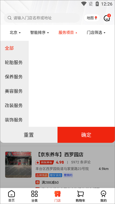 1、用户可以在手机上打开并登录京东养车app,进入门店页面后,app会自动根据用户手机定位快速查询到附近门店信息