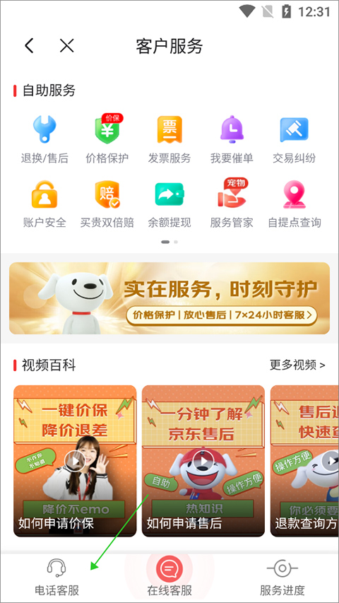 2、在打开的客服页面中,通过点击底部左侧【电话客服】