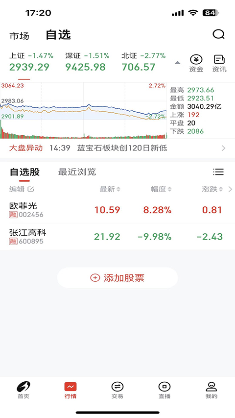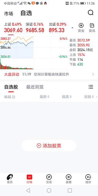 3、行情页面中不仅可以对国内、香港股市行情的全面展示,而且能够添加自选股进行行情分析、下单(在登录交易系统后)
