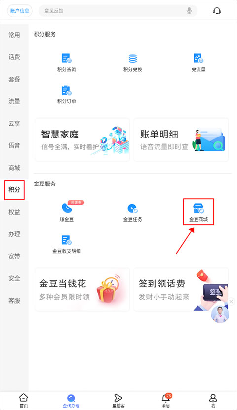 1、在查询办理界面的积分版块,选择“积分商城”