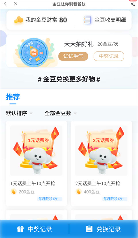 2、进到兑换界面你可以使用金豆兑换花费、优惠券等等。