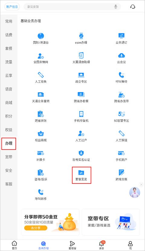 1、在电信营业厅查询办理界面的办理版块中选择“套餐变更”
