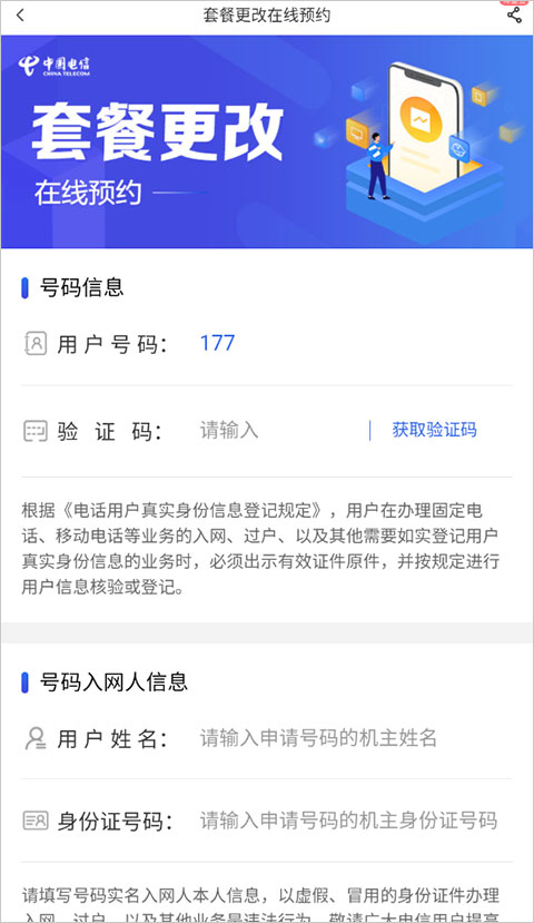 2、进到界面后进行号码信息、号码入网人信息后,即可进行在线预约套餐变更。