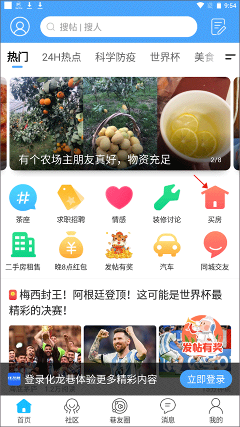 (1)点击下方菜单栏【首页】,上方有很多的功能:茶座、求职招聘、情感等的,点击“买房”。