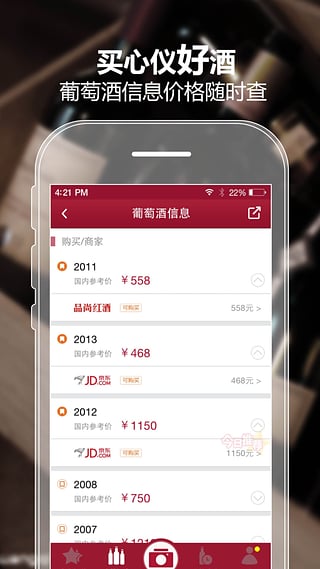 酒咔嚓的美酒推荐来源包括:京东商城、也买酒、酒斛网、酒仙网、网酒网、顺丰优选、1号店、品位汇、品尚红酒、乐酒客、我买网、葡萄酒公社、亚马逊、酒云网等,目前,平台已经先后与微信、手机百度开始了合作,“酒咔嚓”向微信和百度开放了自己的数据库,现在用户通过微信扫一扫和手机百度扫描酒标都能查到葡萄酒信息。喜欢的朋友请下载使用吧!