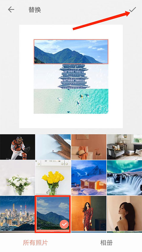 4、在替换界面中,勾选用于替换的图片,选择右上角“打钩”图标,即可删除图片。