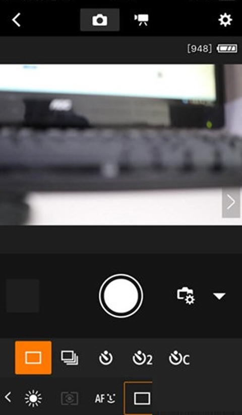 2、链接并进入到该软件的实时拍摄界面后,相机相关设置的调整就在界面的最下端,长方形方框的图标就是驱动模式(单拍,连拍,定时拍摄)的设置的,想要连拍的话需要把设置调整到多个长方形那一项即可,如下图所示: