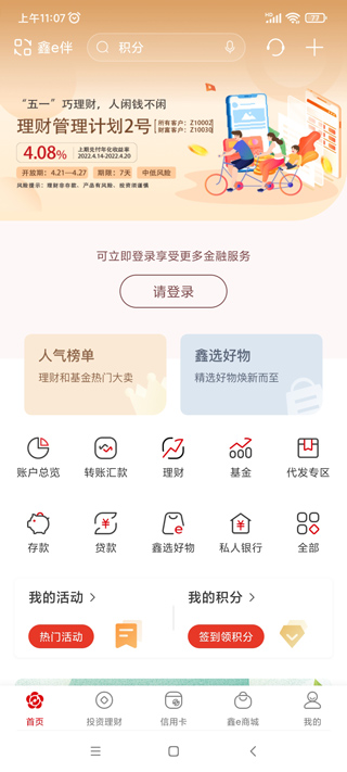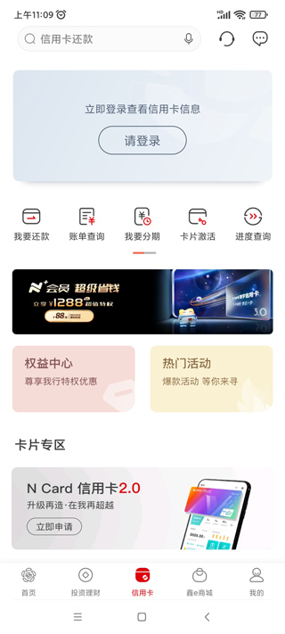 4、点开信用卡,用户登录后可以查看信用卡信息,还可以还款、分期等;
