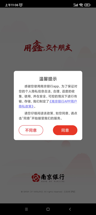 1、下载安装好南京银行你好银行app,运行软件,同意协议;