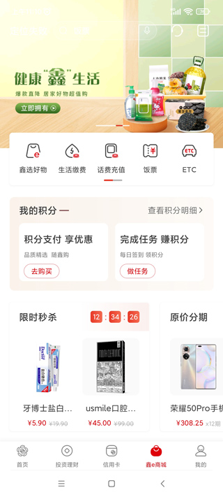 5、在鑫e商城这里,有鑫选好物、生活缴费、话费充值、饭票、etc等功能。