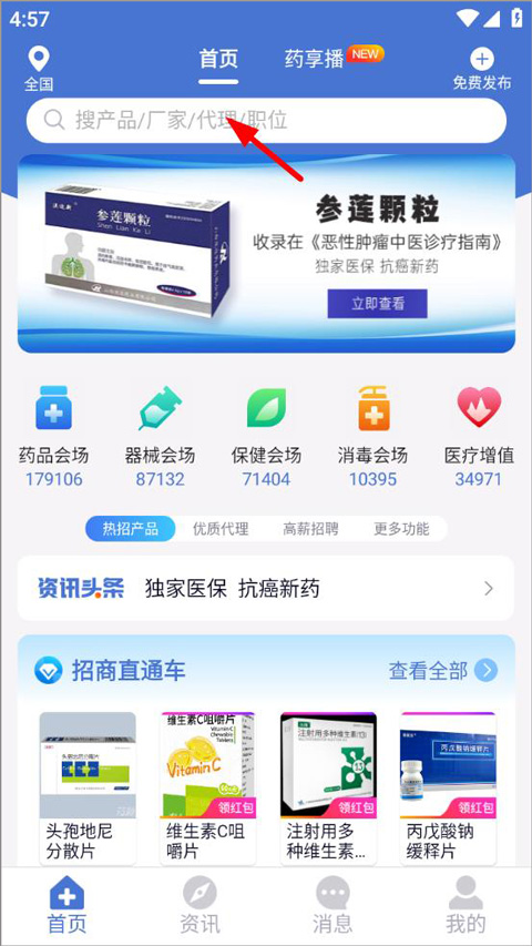 1、用户登录药脉通app后选择代理身份,进入软件主页,用户可搜产品、厂家、职位等,还可查看药品会场、器械会场等,点击上方搜索框输入查找;