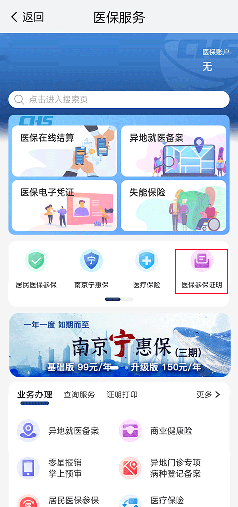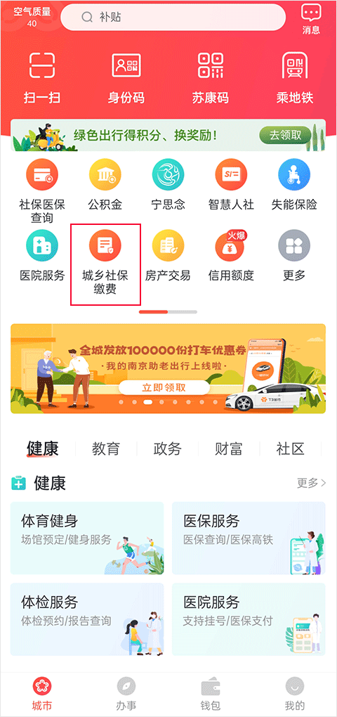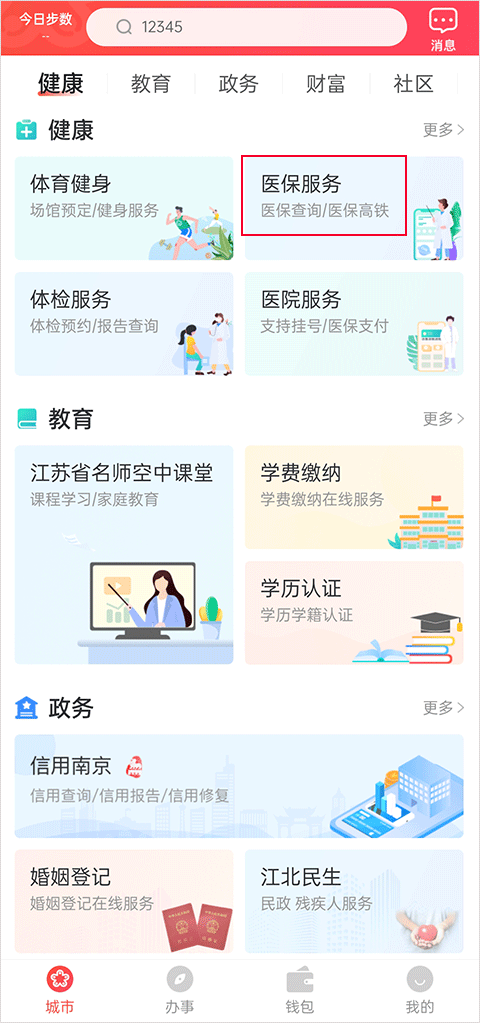 1、首先打开我的南京代缴医保app,进入首页在健康模块,选择医保服务;