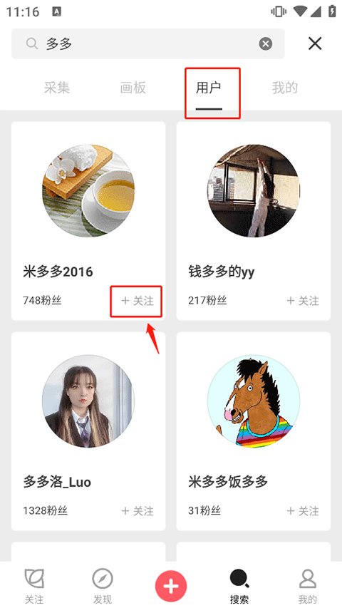 2、搜索结果出来后,在用户界面中点击该用户名片下方的关注即可