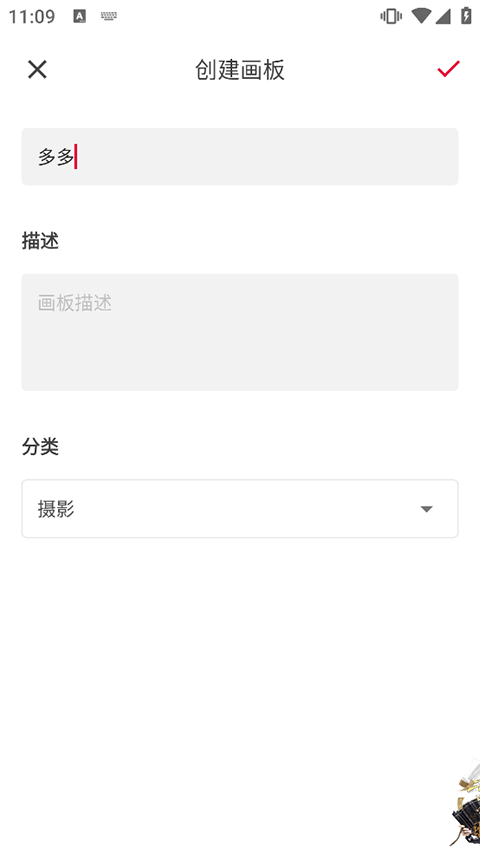 3、将新画板的标题、描述以及类型填写完成后点击右上角【√】完成创建