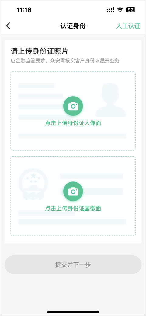 5、如果你选择“身份证照片”认证的话,就需要上次自己的身份证照片正反两面,完成之后点击提交并下一步就基本完成了。