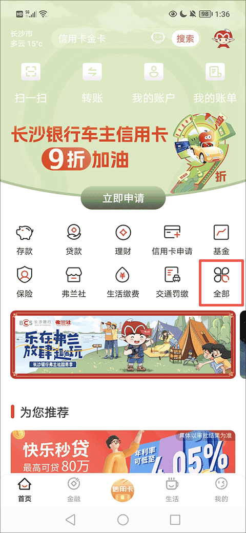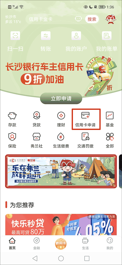 1、在首页找到并点击“信用卡申请”按钮选项;