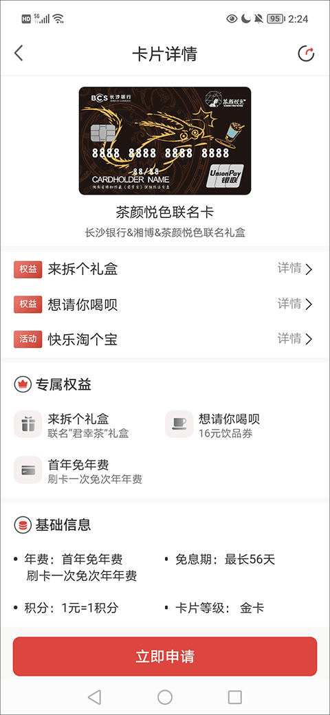3、然后,在卡片详情界面找到并点击“立即申请”按钮选项;