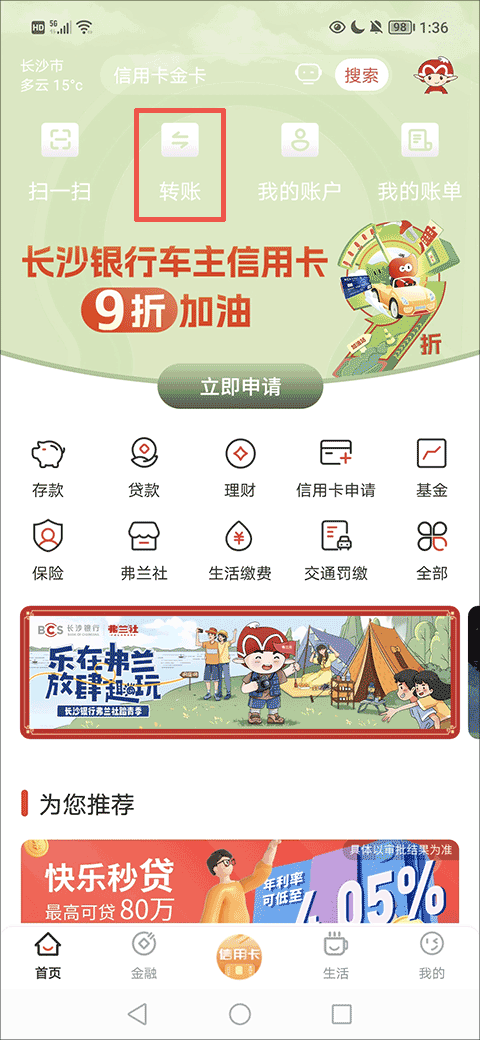 1、在首页,就能找到并点击“转账”按钮选项进入转账界面了;