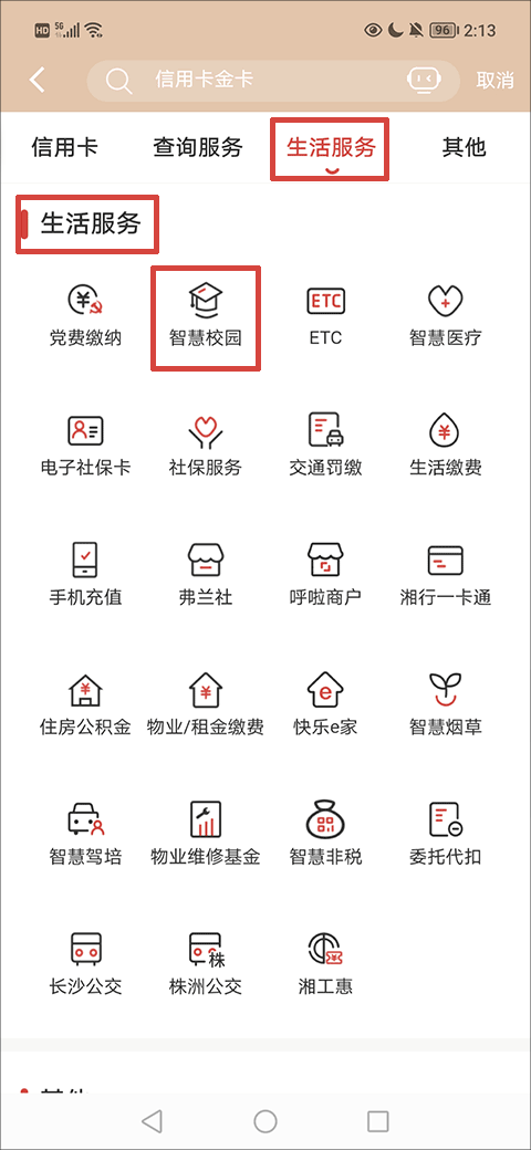 2、在全部功能界面中的生活服务一栏找到并点击“智慧校园”按钮选项;