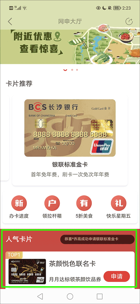 2、在网申大厅中找到人气卡片中的您满意的卡片进行申请;