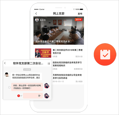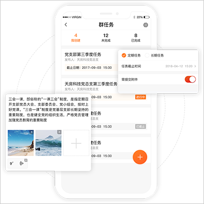 上级下发的支部任务不用再逐个人为通知,支部管理员直接在群聊中发起群 任务,实时监控任务完成进度。