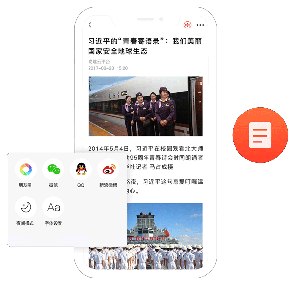 满足个性化需要:语音播报、夜间模式、字体设置、语言转文字等功能以满足党员的阅读偏好。