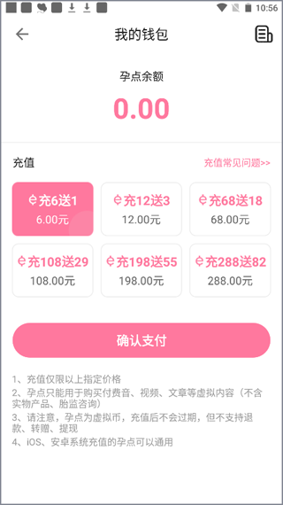 在个人中心―我的钱包,可以进行孕点充值。点击右上角账单,可以查看个人的孕点充值/使用情况。