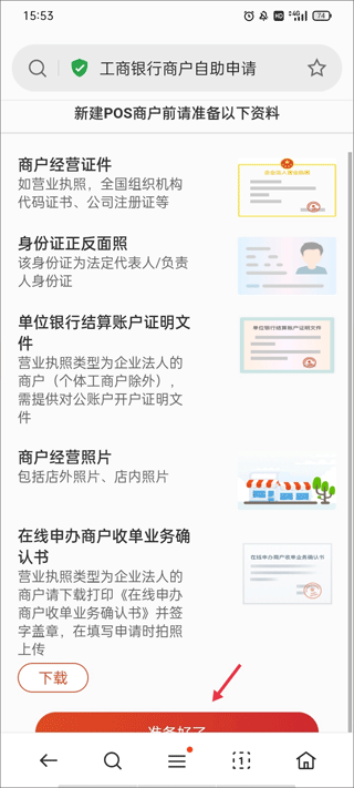 3、这里你要立即申请四项功能,像智能POS收款、二维码等,了解注册时所需要的材料信息,点击“准备好了”。