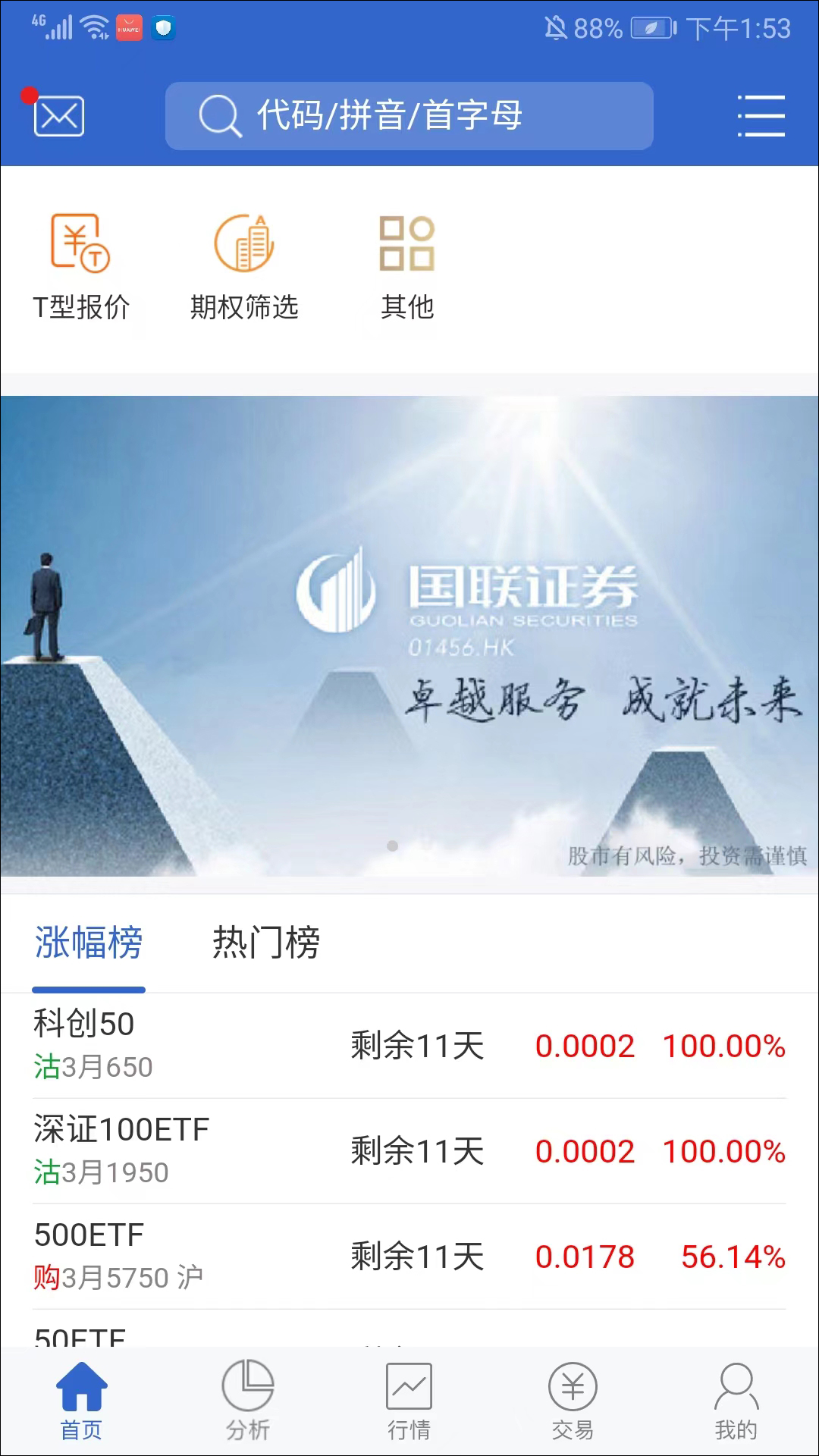 1、打开国联期权app,可看到包括首页、分析、行情、交易和我的栏目,在首页界面我们可以输入代码、拼音和首字母搜索相应的期权,