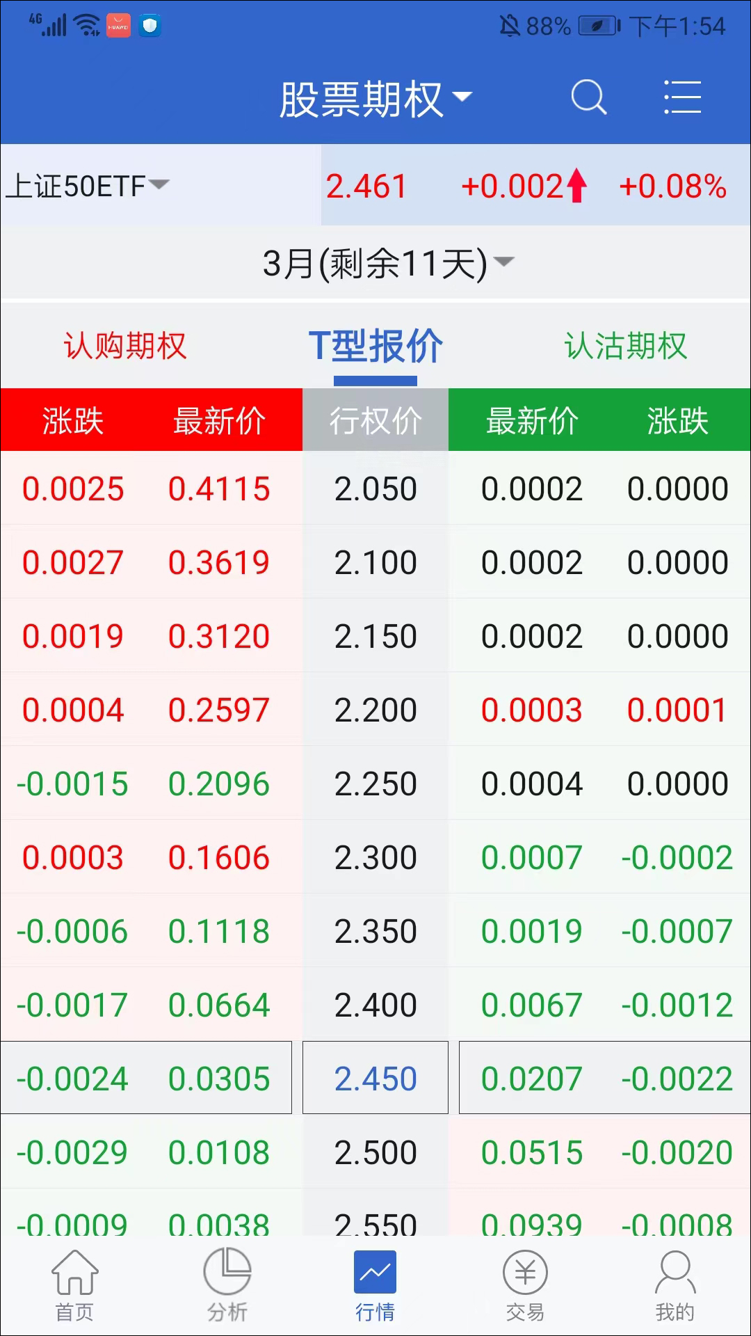 4、在行情界面,可搜索和查看当前的期权价格行情,
