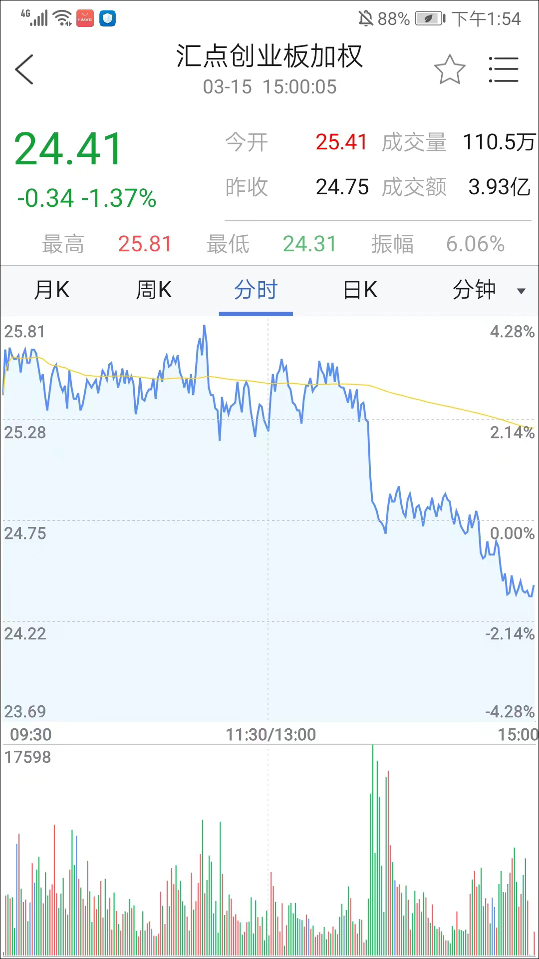 3、这里以汇点创业板加权为例,可看到详细的交易数据和涨幅趋势,