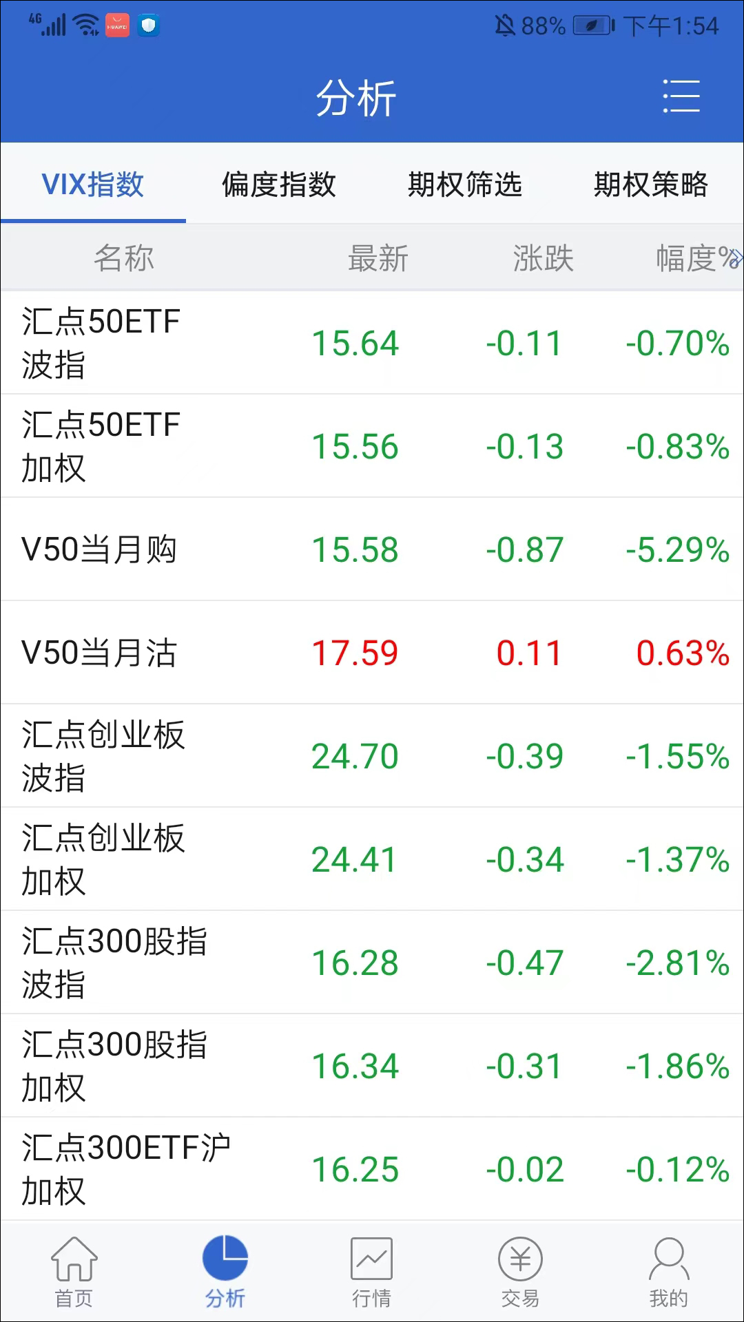 2、在分析界面,可看到不同期权的VIX指数、偏度指数、期权筛选和期权策略等期权类型分析,