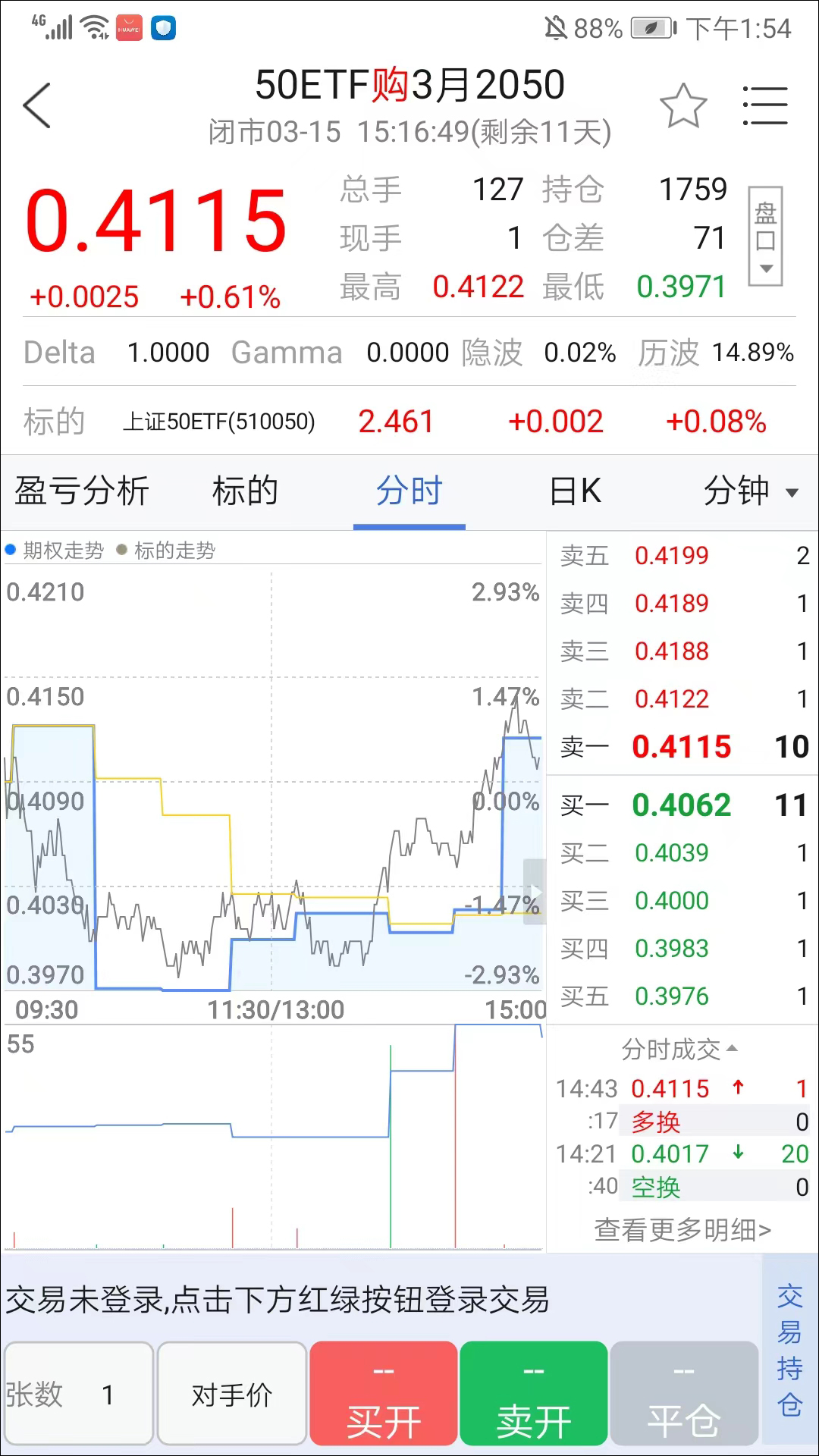 5、选择相应的期权后,可进行买开、卖开和平仓的操作,