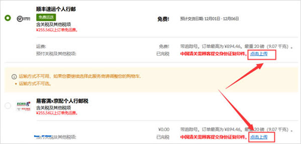 我们在选择物流方式的时候可以看到上图,我们先点击打开新窗口,然后等付款后在线直接提交报关。
