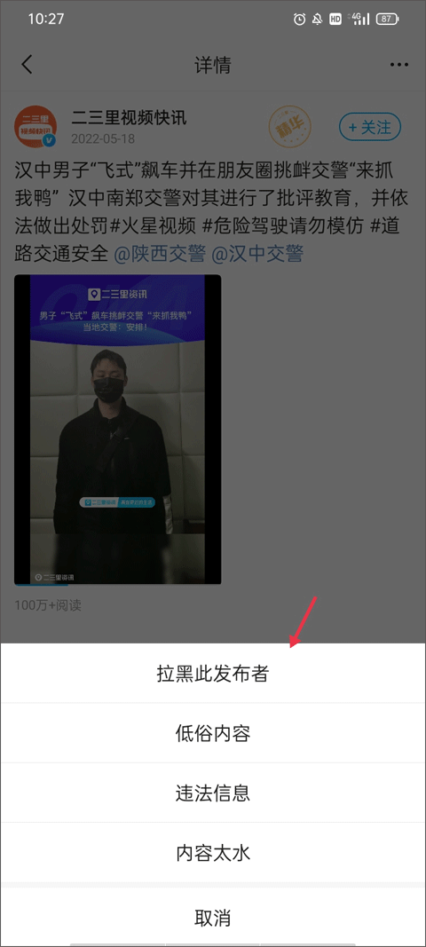 (3)这时下拉就弹出了个功能选项:拉黑此发布者、低俗内容、违法信息、内容太水,选择“拉黑此发布者”,等待页面刷新,你再次查看热门帖子时就看不到这个用户发布的信息了。