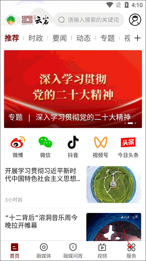 1、打开文昌云岩app,在app下方的列表中找到服务点击进入便民服务列表。