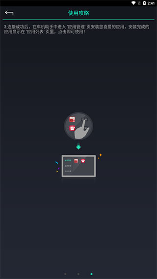 3、连接成功后,在车机助手中进入“应用管理”页安装您喜爱的应用,安装完成的应用显示在“应用列表”页里,点击即可使用。