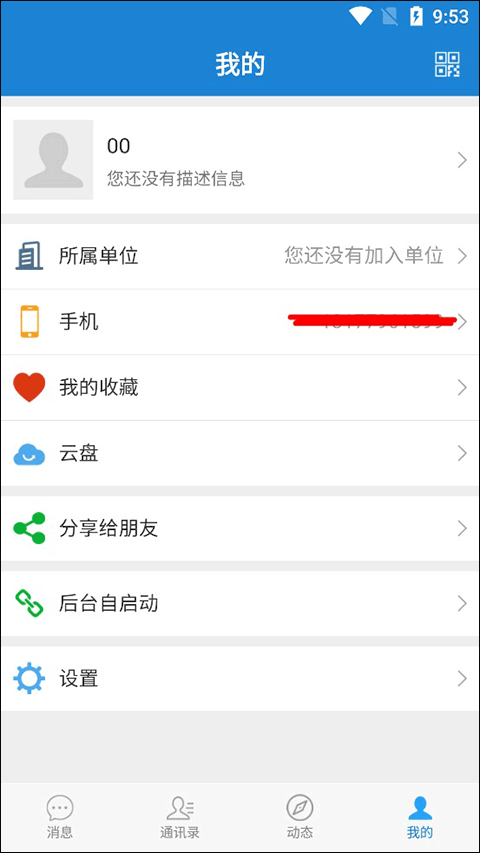 首先我们进入软件可以看见底部有4个主页人口:消息、动态、通讯录和我的、因为我们也是刚刚下载的,连公司所属单位都还没绑定,那这些主页小编先跳过它们,点击我的;进入我的后可以看见我们用户的昵称与头像,下面还有一长列的功能:所属单位、手机、我的收藏、云盘、分享个好友、后台自启动、设置,这个时候我们直接点击所属单位;
