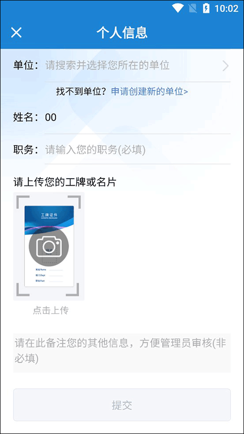 进入后我们需要填写单位类型、查找单位、填写自己的姓名和职务,等最后上传自己的工牌或者名片就好了,当然如果你有其他的事情需要备注可以填写到底下的备注栏、填写完成后可以看见底下的提交键就从灰暗的样子变成高亮的样子了,我们点击它就完成绑定了。