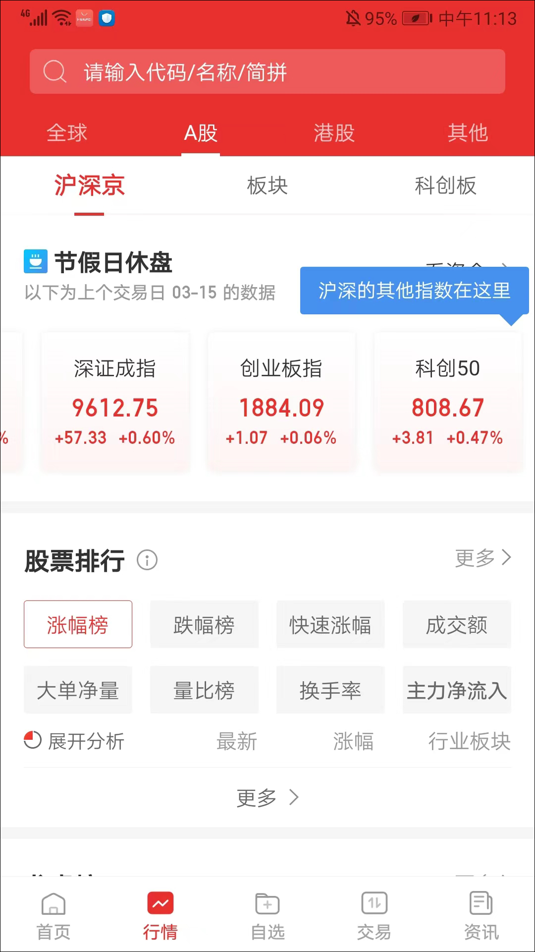 2、在行情界面,包括全球、A股、港股和其他类型的股票数据,