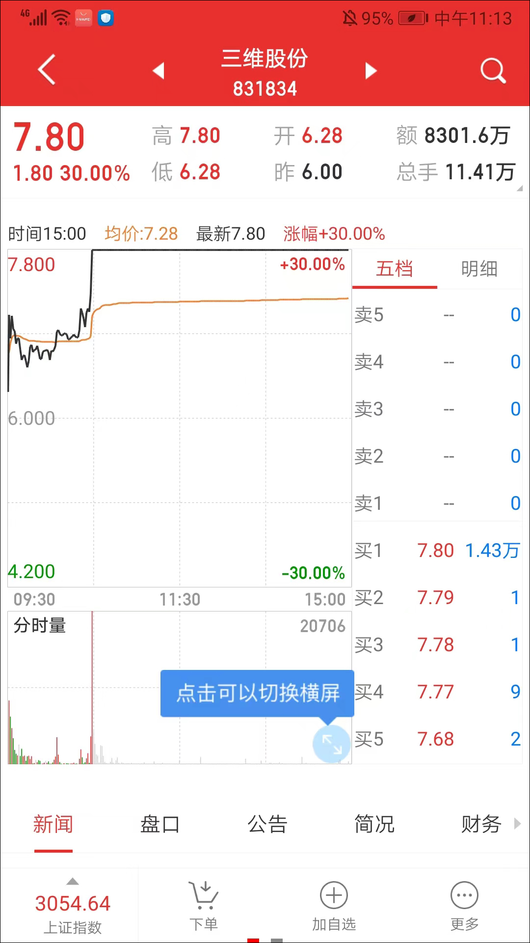 3、这里以三维股份为例,可看到详细的涨幅详细,也可以进行下单和加自选的操作,