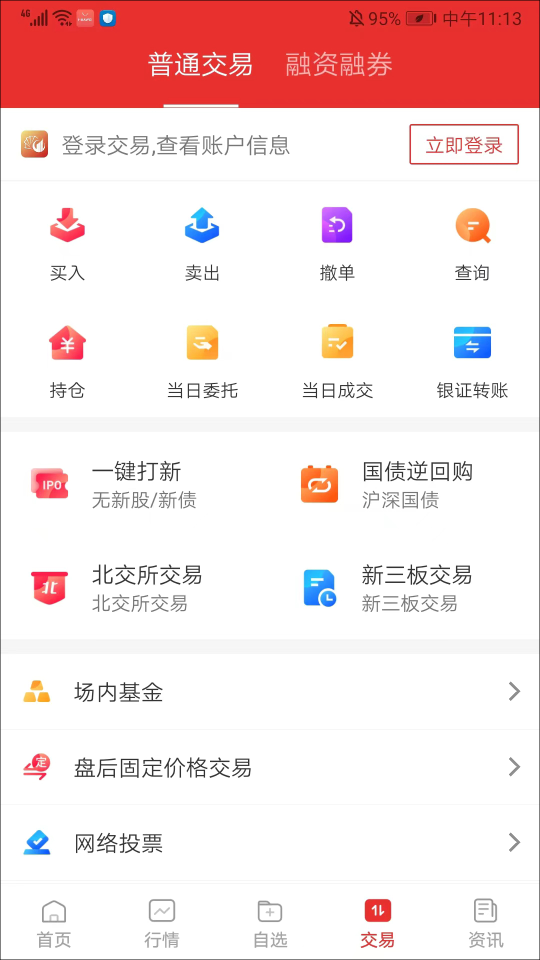 5、在交易界面,可以进行个人账户的买入、卖出、撤单、查询、持仓、委托、成交等相应的操作,