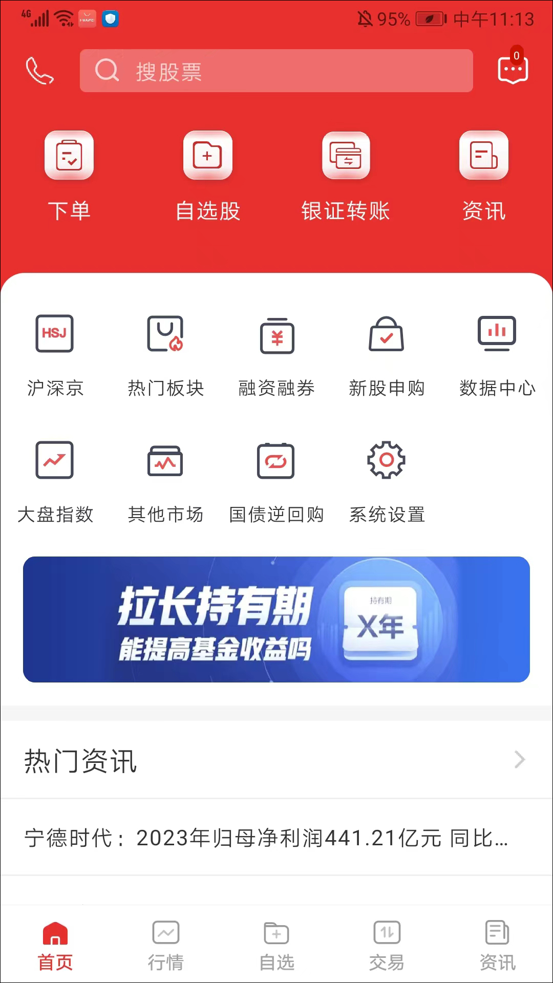 1、打开国联同花顺app,进入应用,分为首页、行情、自选、交易和资讯栏目,在首页界面,用户可根据需求选择使用热门板块、融资融券、新股申购、大盘指数、其他市场的功能选项,