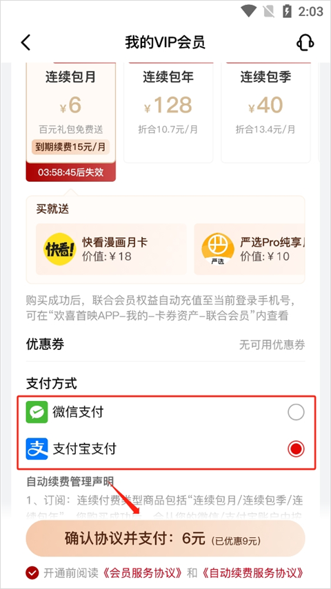 2、进入开通会员页面,首先需要选择套餐,一共有四个,选择一种支付方式,目前软件只支持微信和支付宝付款,选择一种方式之后就可以进行付款了。